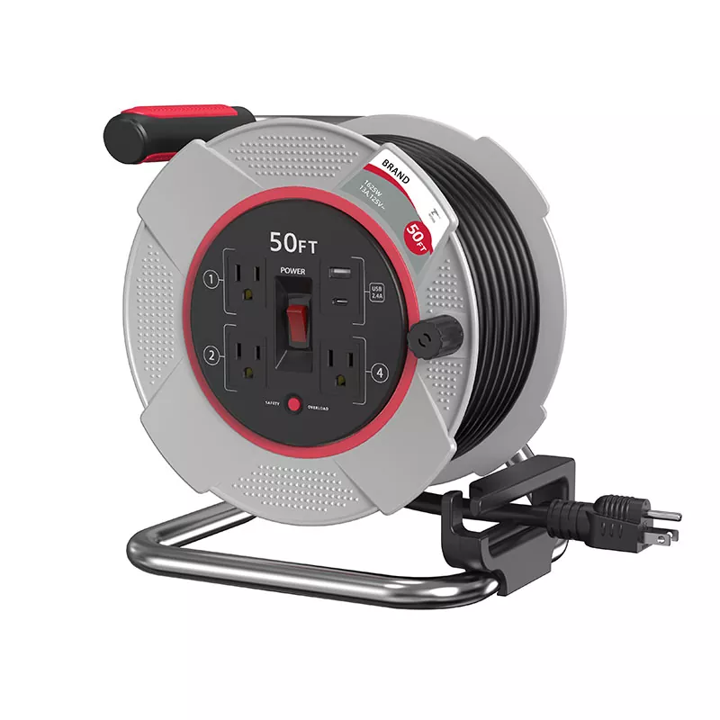 Multifunctional 3 Outlets Usb2.4a Plastic Cord Reel 50ft With Overload Protection can be used in the scene including bedroom ,living room and kitchen.